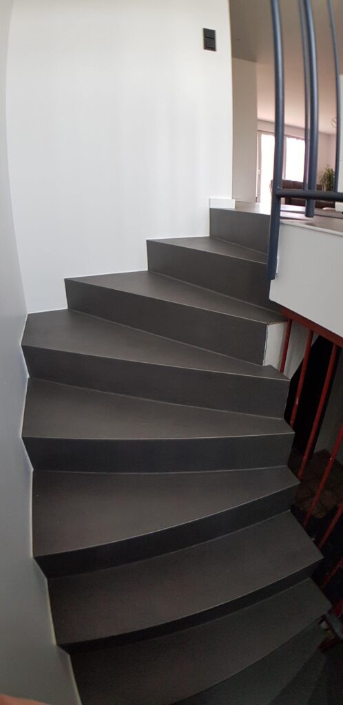 So bekommt Schritt für Schritt die Treppe denselben Look wie der restliche Betonboden. Und Schicht für Schicht verschwindet der ‚Störfaktor alte Treppe‘ und wird zu einem modernen, pflegeleichten und fugenlosen Hingucker in Betonoptik. Um die edle Anmutung der glatten Beton-Oberfläche auf der Treppe noch zu komplettieren, können die Kanten der Stufen mit schmalen Eckleisten aus Edelstahl versehen werden. Diese Edelstahl-Leisten können aus mehreren Gründen optional eingesetzt werden.