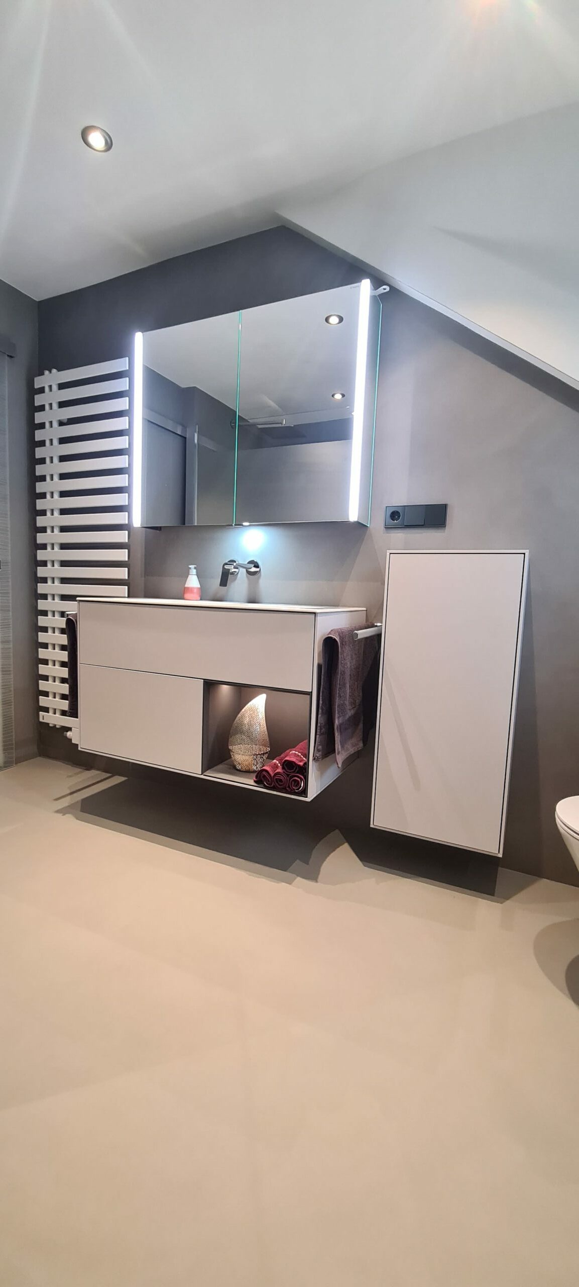 Die alten Fliesen bilden den perfekten Untergrund für ihren Traum von einem fugenlosen Badezimmer. In diesem Projekt war eine bodengleiche Dusche nicht möglich, wodurch ein minimalistisches Podest ausgeführt wurde. Der edle, im Farbton weiß gehaltene, Sumpfkalkputz an der Decke trägt zur Regulierung der Luftfeuchtigkeit bei. In der Wand wurde ein WC-Utensilien Schrank eingelassen, der die klaren Linien des fugenlosen Bades unterstützt und den Raum dadurch ruhiger und aufgeräumter wirken lässt.